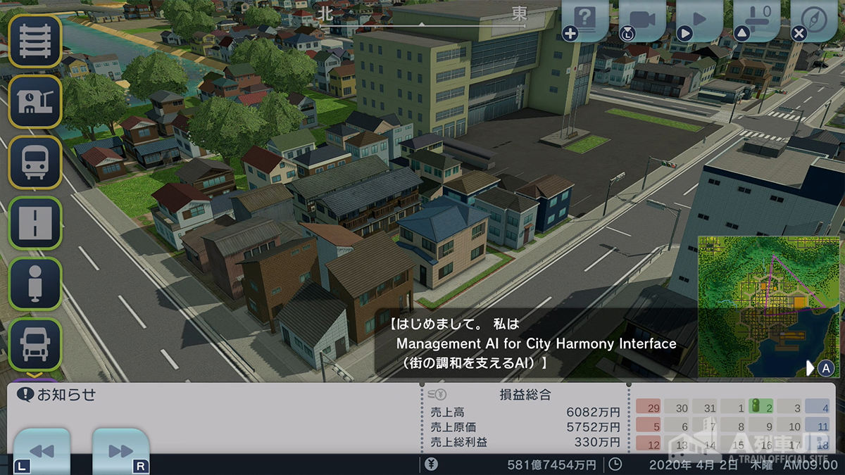 シナリオの開始は2020年。これから交通、エネルギー、環境、観光など、都市全体の管理をAIによって行う実験が始まります。そのための専用の街が、本シナリオの舞台です。社長(プレイヤー)と仲間たちはこの実験に、「交通、インフラ部門」で協力します。いつもの開発と違う点は、「AIによる管理」が入ることです。AIは主に事業の計画を立てて、それを提案してくれます。