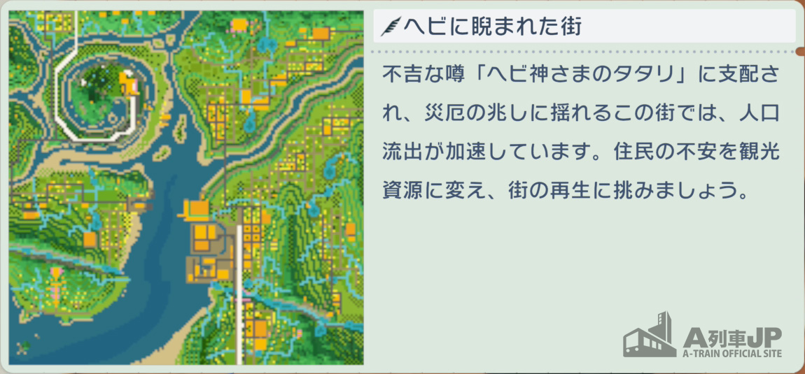 A列車で行こう ポータルサイト > 特別企画 > A列車jp発「はじまるA列車シナリオ攻略ガイド:制作者が教える!ヘビに睨まれた街」