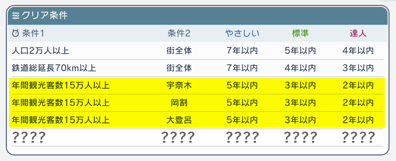 人口と鉄道総延長は、ここまでの段階でクリアできている方もいれば、「まだもう少し!」という方もいらっしゃるかもしれません。