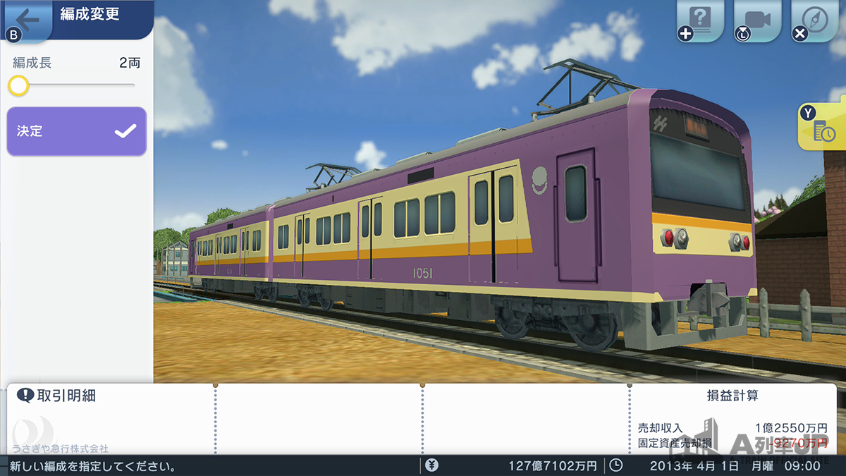 初期配置の列車は総じて編成が長めですが、序盤は乗客が少ないです。そこで、短縮すると少しでもムダを省けます。(通勤列車は2両編成に、近郊列車は1~2両編成に)