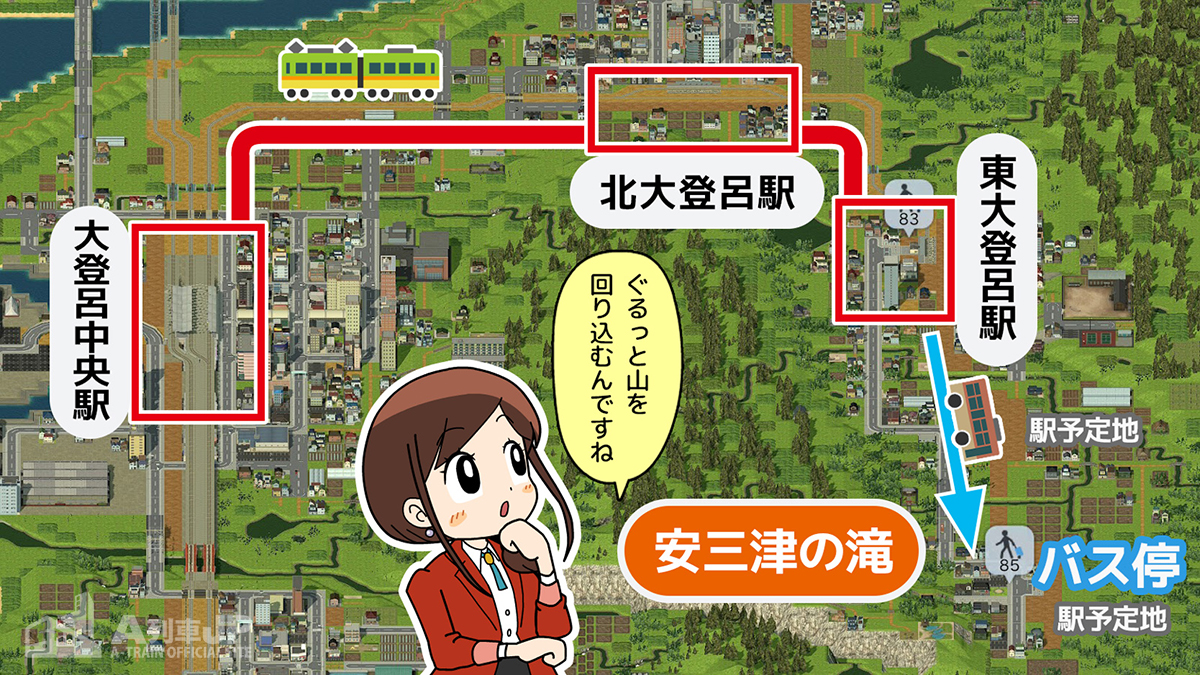 また、安三津線の中間駅(北大登呂駅)付近にはバス停を設置しましょう。東の隣町(東登呂)からの観光客はここで乗り換えてもらいます。周囲の発展も期待できそうです。