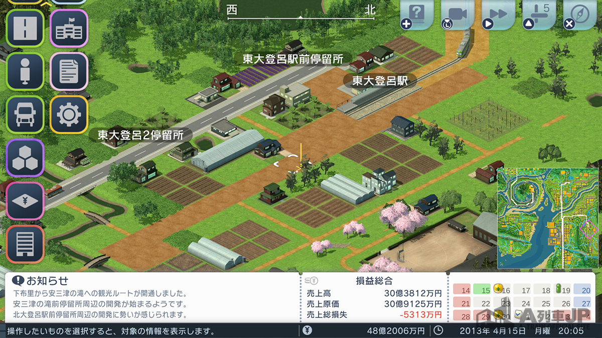 鉄道とバスと用地購入以外は何もいじっていませんが、この規模の集落としては立派に育ちました。鉄道線で一気に安三津の滝まで直通させていたら、なかなかこうは行きません。