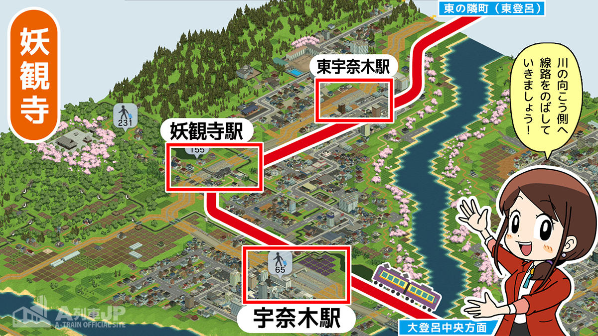 今回は、鉄道駅を妖観寺への最寄り駅とし(妖観寺駅)、宇奈木駅と結びました。