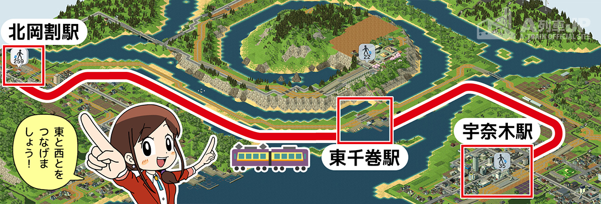 宇奈木駅から支線を延ばし、川を渡ります。千巻エリアのうずまきの細い部分(ヘビ神様のしっぽ)を通って、北岡割駅とつなげます。ここでは『東西連絡ルート』と呼びます。