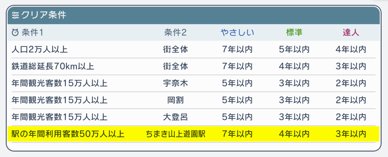 3カ所すべての年間観光客数目標を達成すると、何度かの会話イベントを挟んだのち、6番目のクリア条件『駅の年間利用客数 50万人以上 ちまき山上遊園駅』が提示されます。