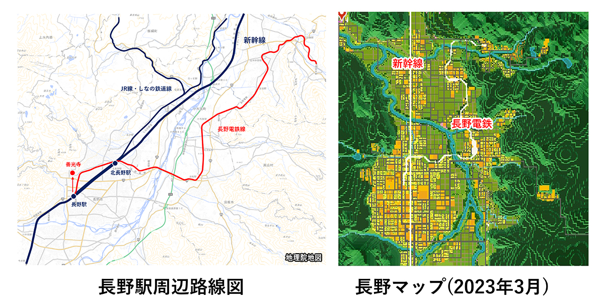 実は筆者は3年前に長野マップを作ったことがあります。2023年1月の長野旅行で善光寺を中心とした長野駅中心の街並み、長野電鉄終点である湯田中温泉の風景に魅了され、帰ってすぐに再現に着手したのです。