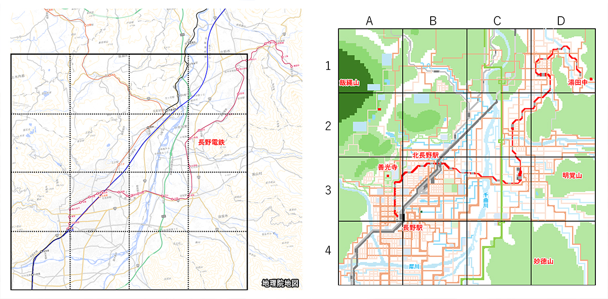 長野マップは長野電鉄全線を再現したいのですが、20×20kmでも足りません。全体を縮小すると都心の再現が難しくなるため、建物の多い中心地は縮尺を大きく、周辺部は小さく調整。はみ出してしまう長野電鉄の末端区間(信州中野~湯田中温泉間)は、大幅にデフォルメして右上の区画(D1)に収めることにしました。