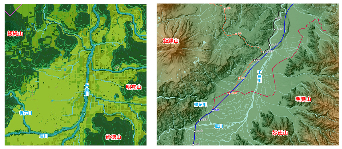丘陵は単にマスを積み上げるのではなく、河川の浸食によって生成された崖線を意識して作り込んでいきます。また河川はいつも通り全ての地面を1マス上げてから、河川の部分だけを掘り下げて、湖のタイルを配置しています。作成したマップが左の図、右が地形図です。前述の通り長野市街地のスペースを広く取ったことで、千曲川が実際よりやや膨らんでいる以外は、ほぼ正確に再現できたことが分かります。