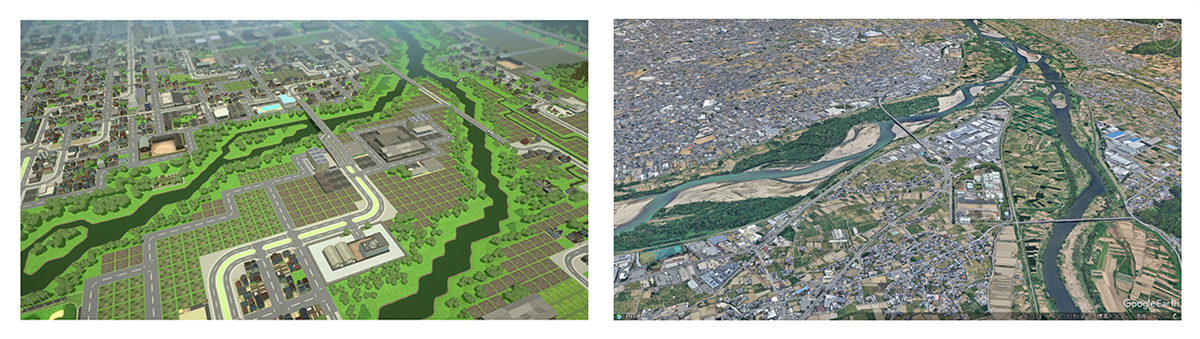 実際の画像を見てみましょう。まずは川中島の千曲川と犀川の合流点です。道路は配置上の制約がありますが、川は比較的自由に形を整えられるので、かなり正確に再現することができました。大河川は幅を広く取り、中洲を設けるとリアリティが増します。