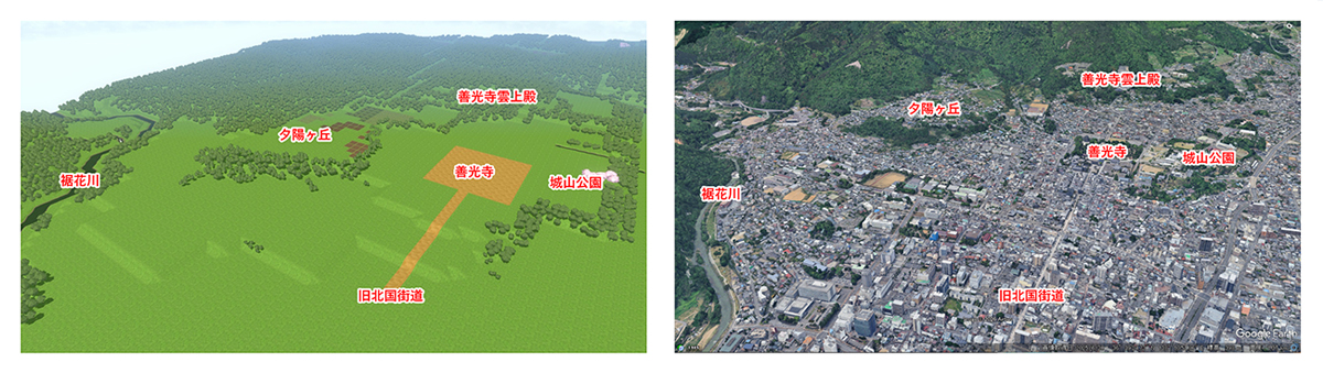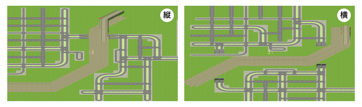 両パターンを比べてみると、縦向きでは善光寺口(西口)、横向きでは東口の道路配置が自然となり、反対は歪んでしまいます。今回はマップのテーマである善光寺口の再現を優先し、縦向きで作ることにします。