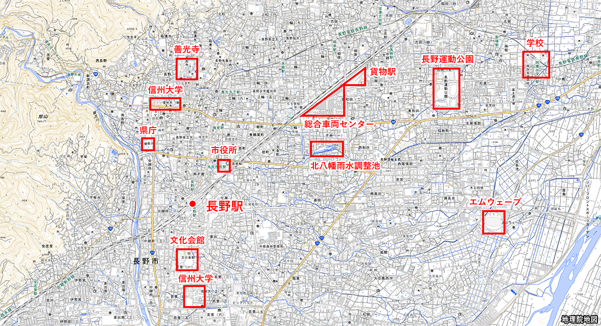 続いて裾花川です。善光寺周辺は、この川が作り出した緩やかな扇状地の扇頂部にあり、長野駅付近とは約2キロで30mもの高低差があります。市街地から善光寺、背後の段丘、そして山地へと続く地形の再現は本マップの中核ともいえる重要事項でした。