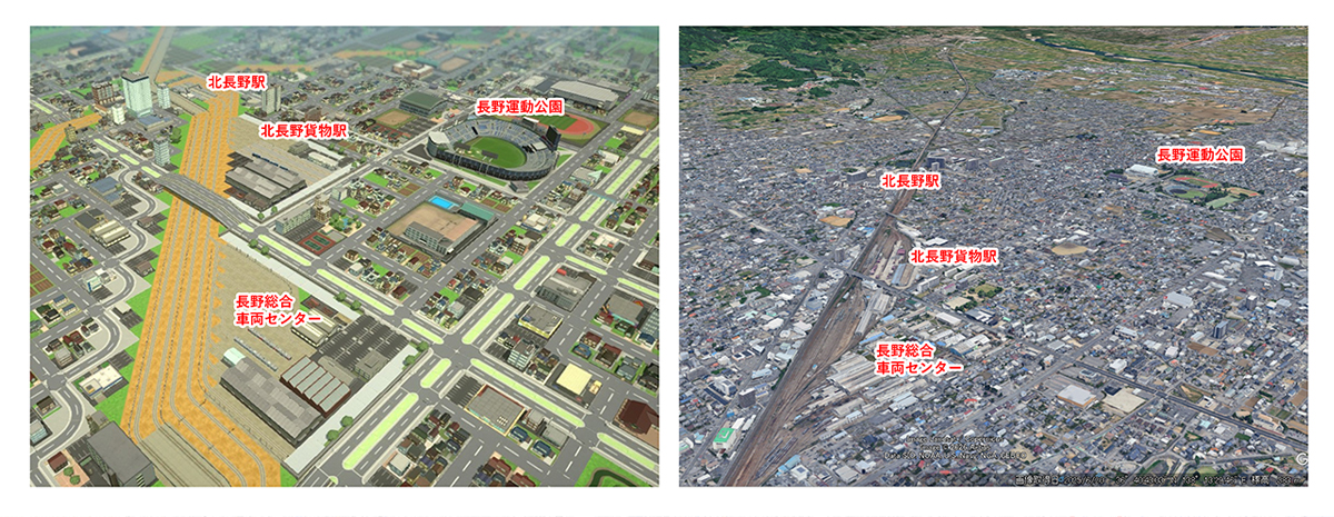 改めて地図を見ながら設計の方向性を確認しましょう。前述のように長野のJR線・しなの鉄道線はほぼ斜めの直線です。その他の主要道路も多くが東西、南北方向のため、新幹線にこだわらなければ再現が容易なマップと言えそうです。