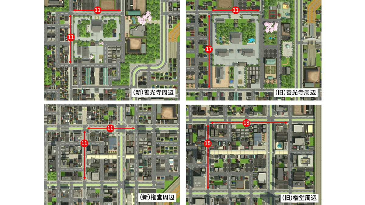 善光寺周辺と権堂周辺の新旧マップを比較すると、前者は187マスから121マス、後者は270マスから121マスへ面積が縮小しています。これによりビル配置などに制約が生じましたが、駅東口の大規模施設用スペースが確保できたことで全体的なバランスが向上しました。後から大型の建物を入れようとすると大工事が必要になるので、再現のキモとなる施設は事前にしっかり確認しておきましょう。